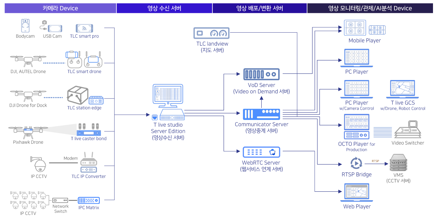 현장에서 촬영되는 모든 영상을 고화질·저지연으로 실시간 관제하고, 원격 제어와 AI 영상분석까지 제공하는 통합 실시간 영상관제 플랫폼 입니다.